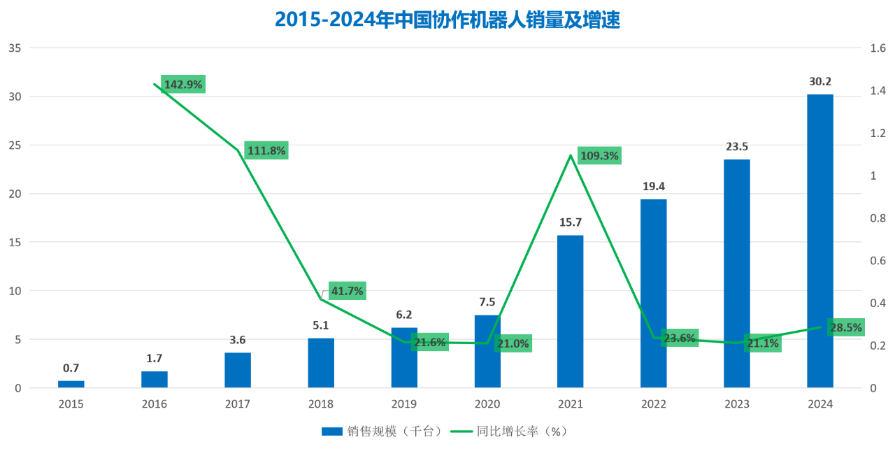 协作机器人作为工业机器人的重要分支,凭借其安全性高、部署灵活、操作简便等优势,正成为制造业转型升级的关键抓手。2024年全球协作机器人整体市场销量达6.8万台,同比增长约24.5%。