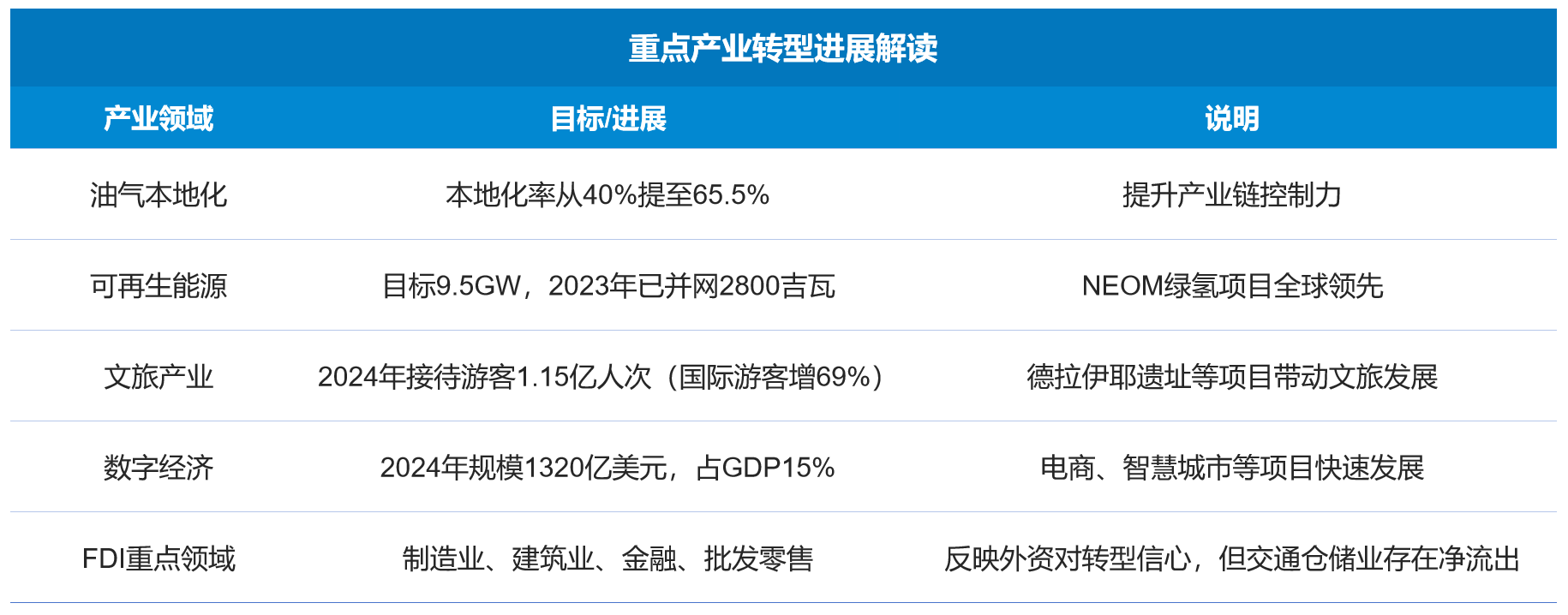 “2030愿景”是沙特转型纲领,核心是“夯实传统产业+培育新兴产业”:传统领域,油气产业本地化率从40%提至65.5%,矿业吸引私营部门参与;新兴领域,新能源目标产9.5GW可再生能源(2023年2800吉瓦并入电网),文旅业2024年接待游客1.15亿人次(国际游客增69%),数字经济2024年规模1320亿美元(占GDP15%)。