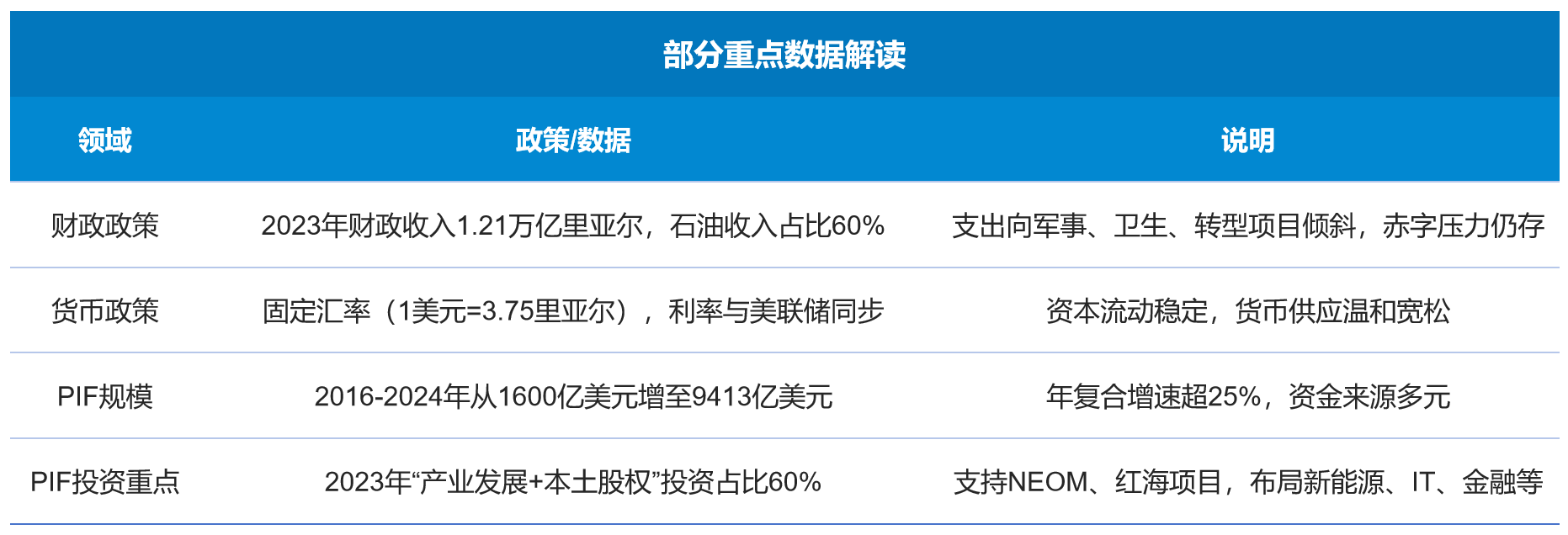 PIF(沙特主权财富基金)是经济转型关键工具,2016-2024年资产管理规模从1600亿美元增至9413亿美元,年复合增速超25%。资金来源包括央行注资、国有资产划转(如2024年接收沙特阿美8%股份)、国际融资(2024年150亿美元银团贷款)等;投资重心“本土倾斜”,2023年“产业发展+本土股权”投资占比60%(2021年为40%),重点支持NEOM新城、红海项目等,同时布局新能源、IT、金融等新兴领域,2023年能源、房地产、信息技术占其投资比重超50%,既引导产业转型,又推动资本市场扩容(2024年沙特上市公司市值占GDP2-3倍)。