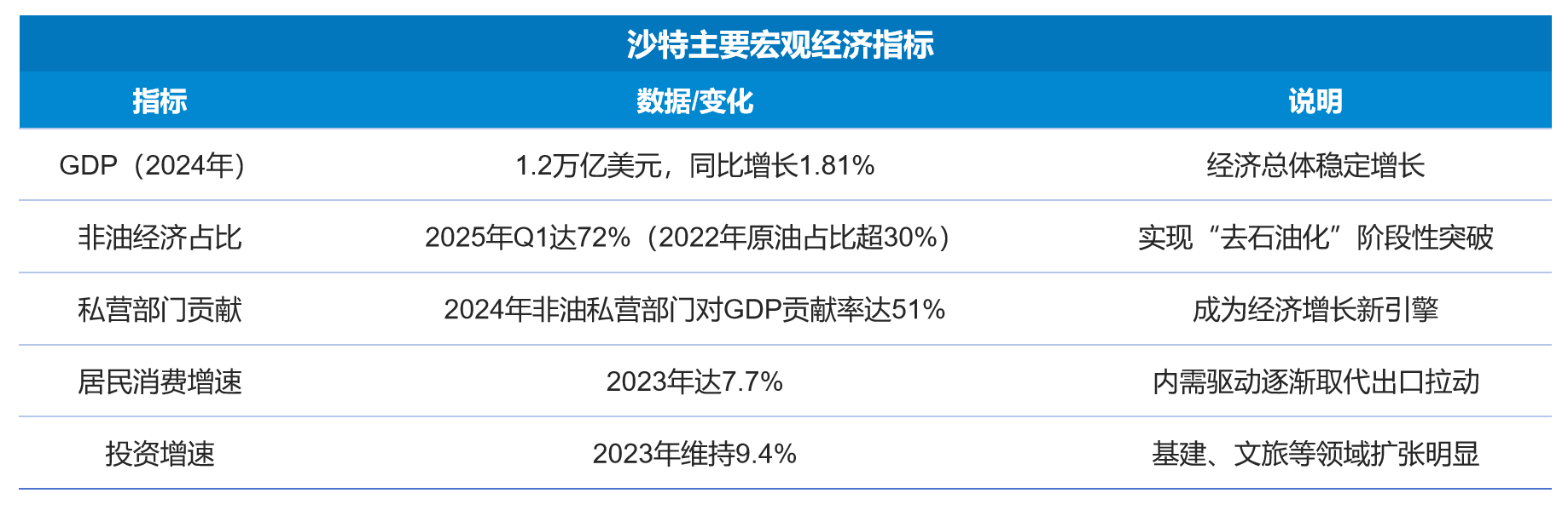 沙特经济正经历关键转型,2024年GDP达1.2万亿美元,同比增长1.81%,核心变化在于非油经济的崛起——2025年Q1非油部门占GDP比重升至72%,较2022年(原油部门占比超30%)实现“去石油化”阶段性突破。这种转型并非偶然,而是源于私营部门扩张与新兴产业培育:2024年非油私营部门对GDP贡献率达51%,超2024年目标(46%),且2021-2024年Q3私营资本在沙特主权财富基金(PIF)主导项目中累计投资373.3亿美元,成为经济增长新引擎。