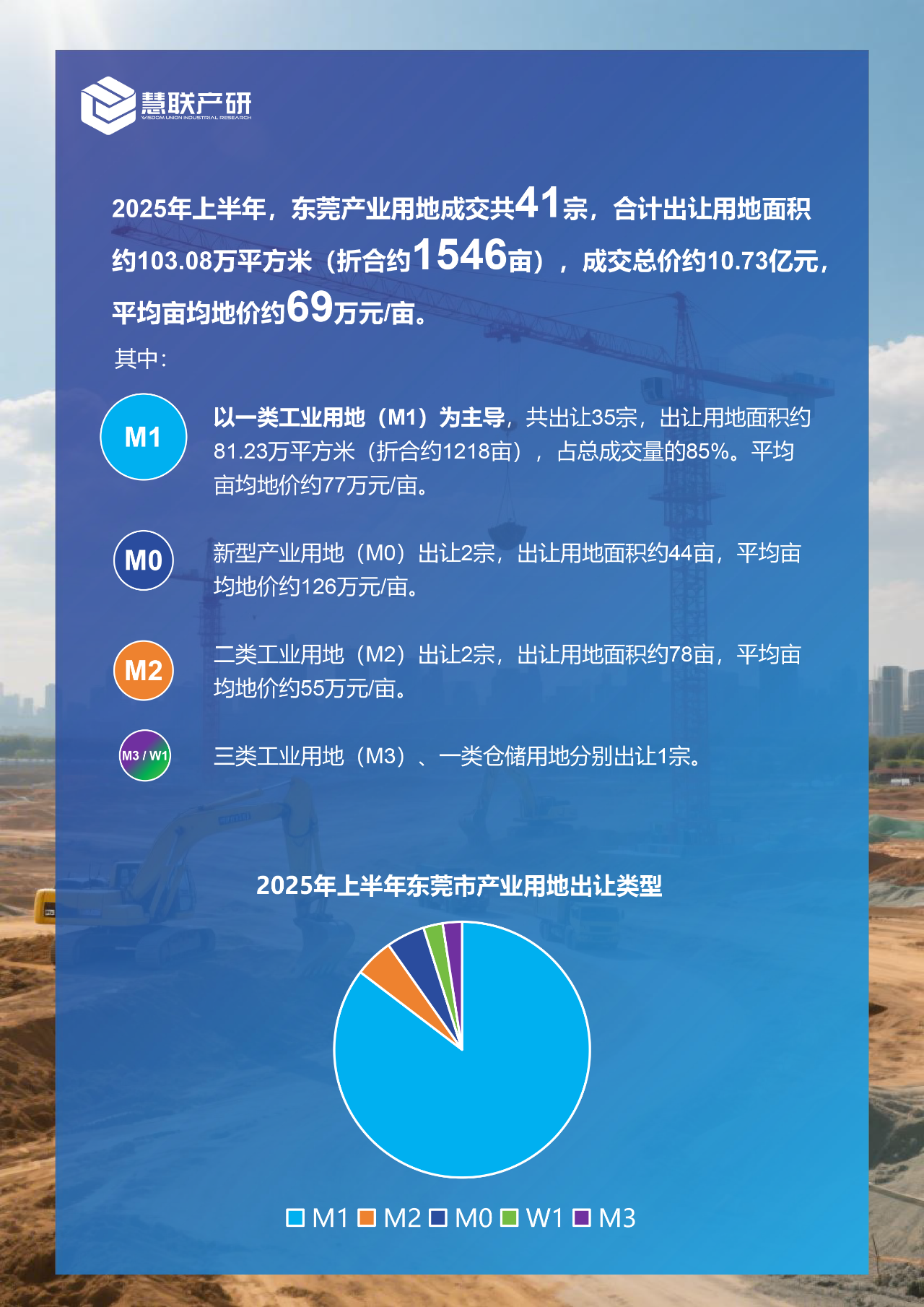 其中:以一类工业用地(M1)为主导,共出让35宗,出让用地面积约81.23万平方米(折合约1218亩),占总成交量的85%。平均亩均地价约77万元/亩。