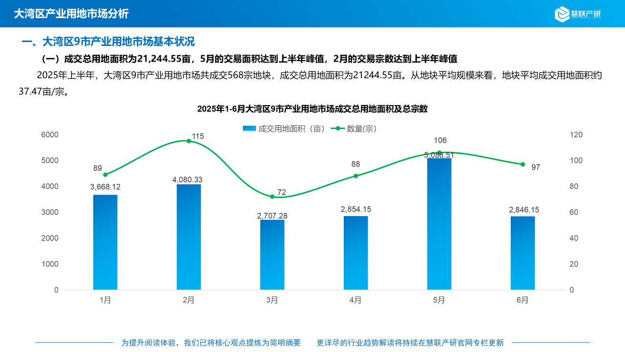 2025年上半年,大湾区9市产业用地市场共成交568宗地块,成交总用地面积为21,244.55亩。从地块平均规模来看,地块平均成交用地面积约37.47亩/宗。