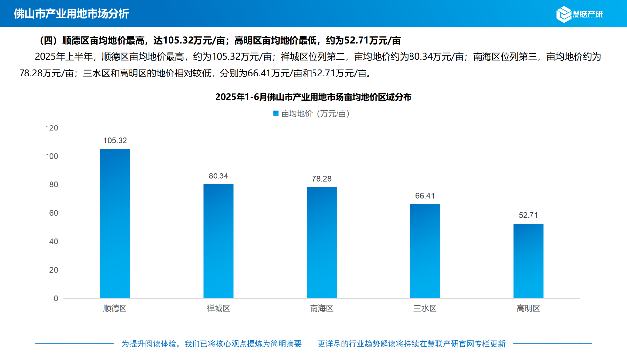 (四)顺德区亩均地价最高,达105.32万元/亩;高明区亩均地价最低,约为52.71万元/亩