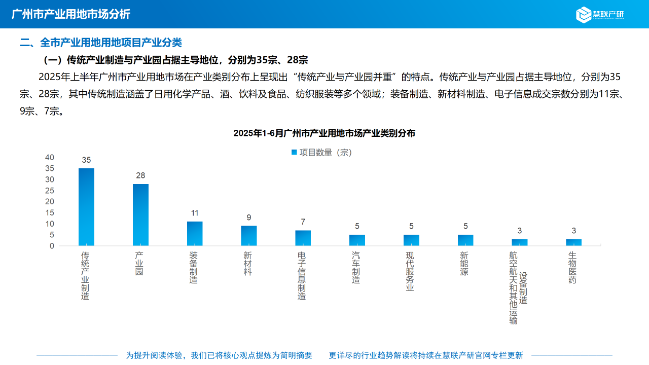2025年上半年广州市产业用地市场在产业类别分布上呈现出“传统产业制造与产业园并重”的特点。传统产业制造与产业园占据主导地位,分别为35宗、28宗,其中传统产业制造涵盖了日用化学产品、酒、饮料及食品、纺织服装等多个领域;装备制造、新材料制造、电子信息成交宗数分别为11宗、9宗、7宗。