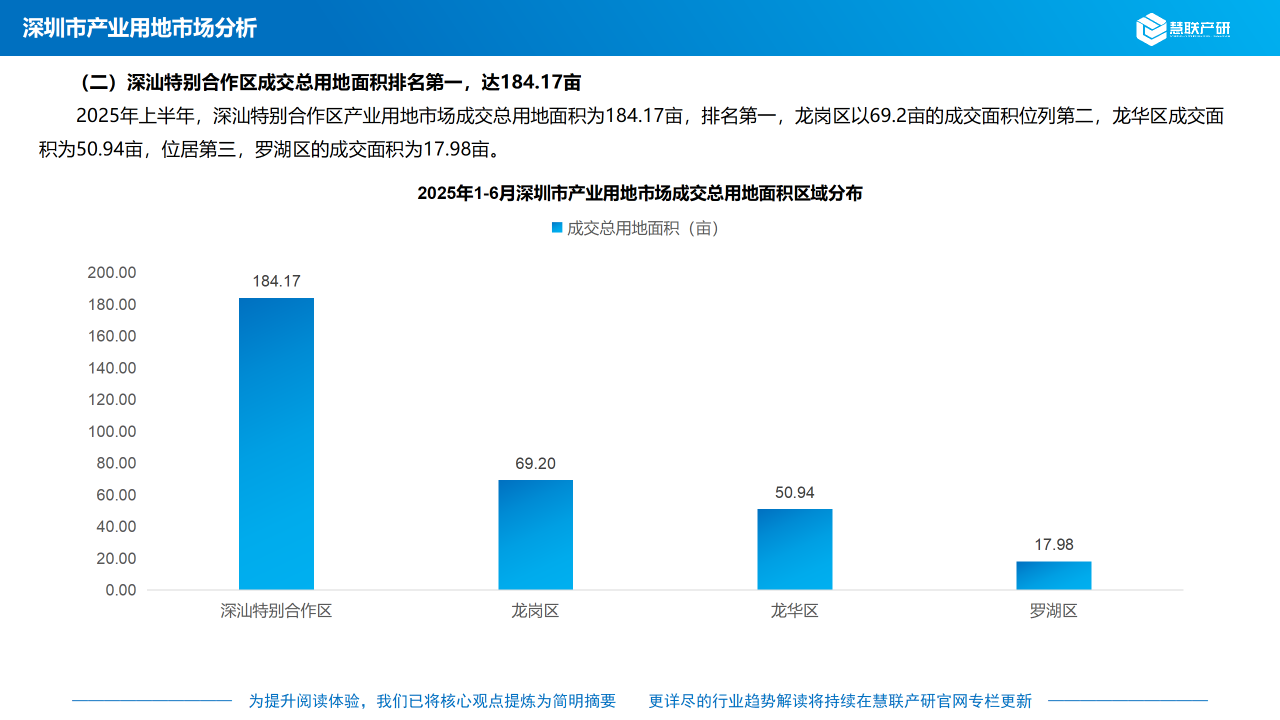 2025年上半年,深汕特别合作区产业用地市场成交总用地面积为184.17亩,排名第一,龙岗区以69.2亩的成交面积位列第二,龙华区成交面积为50.94亩,位居第三,罗湖区的成交面积为17.98亩。