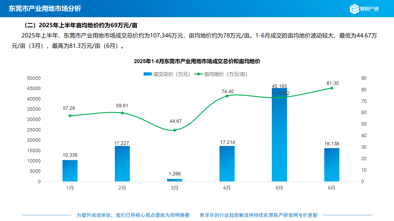 2025年上半年,东莞市产业用地市场成交总价约为107,346万元,亩均地价约为78万元/亩。1-6月成交的亩均地价波动较大,最低为44.67万元/亩(3月),最高为81.3万元/亩(6月)。