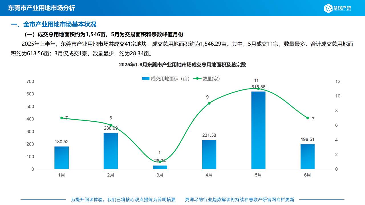 2025年上半年,东莞市产业用地市场共成交41宗地块,成交总用地面积约为1,546.29亩。其中,5月成交11宗,数量最多,合计成交总用地面积约为618.56亩;3月仅成交1宗,数量最少,约为28.34亩。