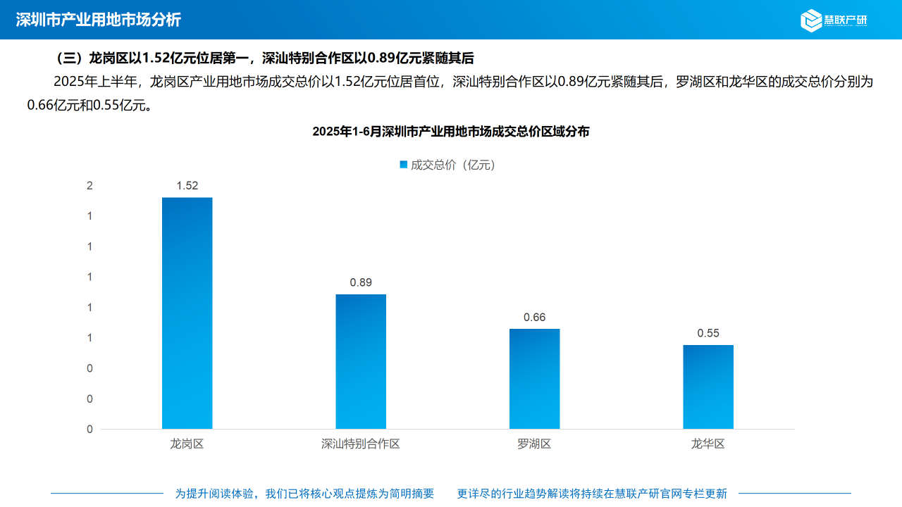 2025年上半年,龙岗区产业用地市场成交总价以1.52亿元位居首位,深汕特别合作区以0.89亿元紧随其后,罗湖区和龙华区的成交总价分别为0.66亿元和0.55亿元。