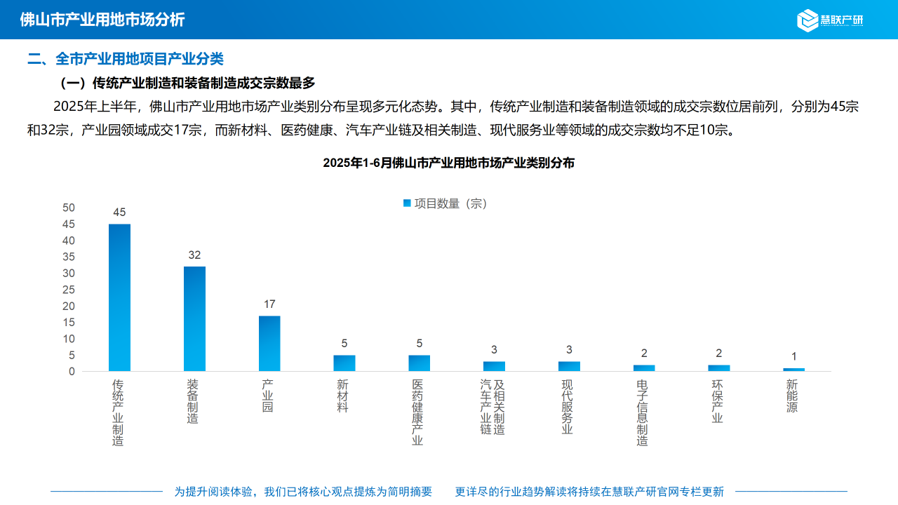 2025年上半年,佛山市产业用地市场产业类别分布呈现多元化态势。其中,传统产业制造和装备制造领域的成交宗数位居前列,分别为45宗和32宗,产业园领域成交17宗,而新材料、医药健康、汽车产业链及相关制造、现代服务业等领域的成交宗数均不足10宗。