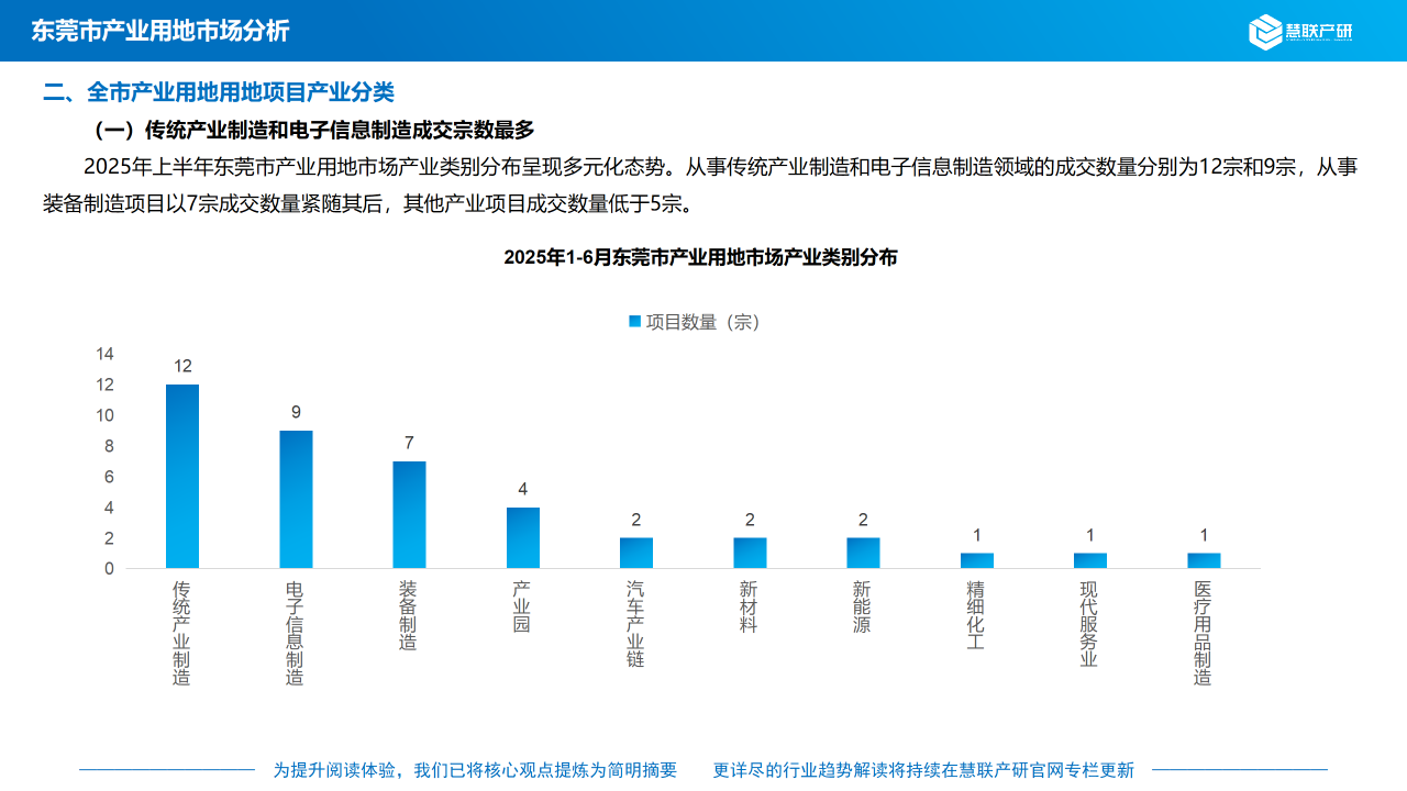 2025年上半年东莞市产业用地市场产业类别分布呈现多元化态势。从事传统产业制造和电子信息制造领域的成交数量分别为12宗和9宗,从事装备制造项目以7宗成交数量紧随其后,其他产业项目成交数量低于5宗。
