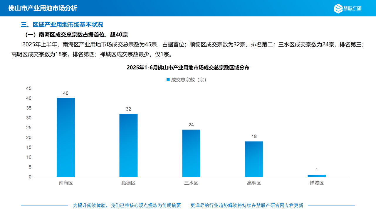 2025年上半年,南海区产业用地市场成交总宗数为45宗,占据首位;顺德区成交宗数为32宗,排名第二;三水区成交宗数为24宗,排名第三;高明区成交宗数为18宗,排名第四;禅城区成交宗数最少,仅1宗。