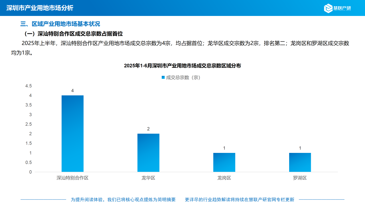 2025年上半年,深汕特别合作区产业用地市场成交总宗数为4宗,均占据首位;龙华区成交宗数为2宗,排名第二;龙岗区和罗湖区成交宗数均为1宗。