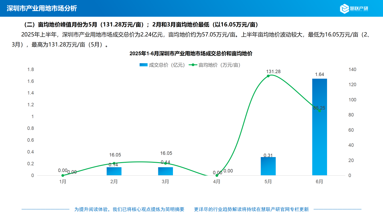 2025年上半年,深圳市产业用地市场成交总价为2.24亿元,亩均地价约为57.05万元/亩。上半年亩均地价波动较大,最低为16.05万元/亩(2、3月),最高为131.28万元/亩(5月)。
