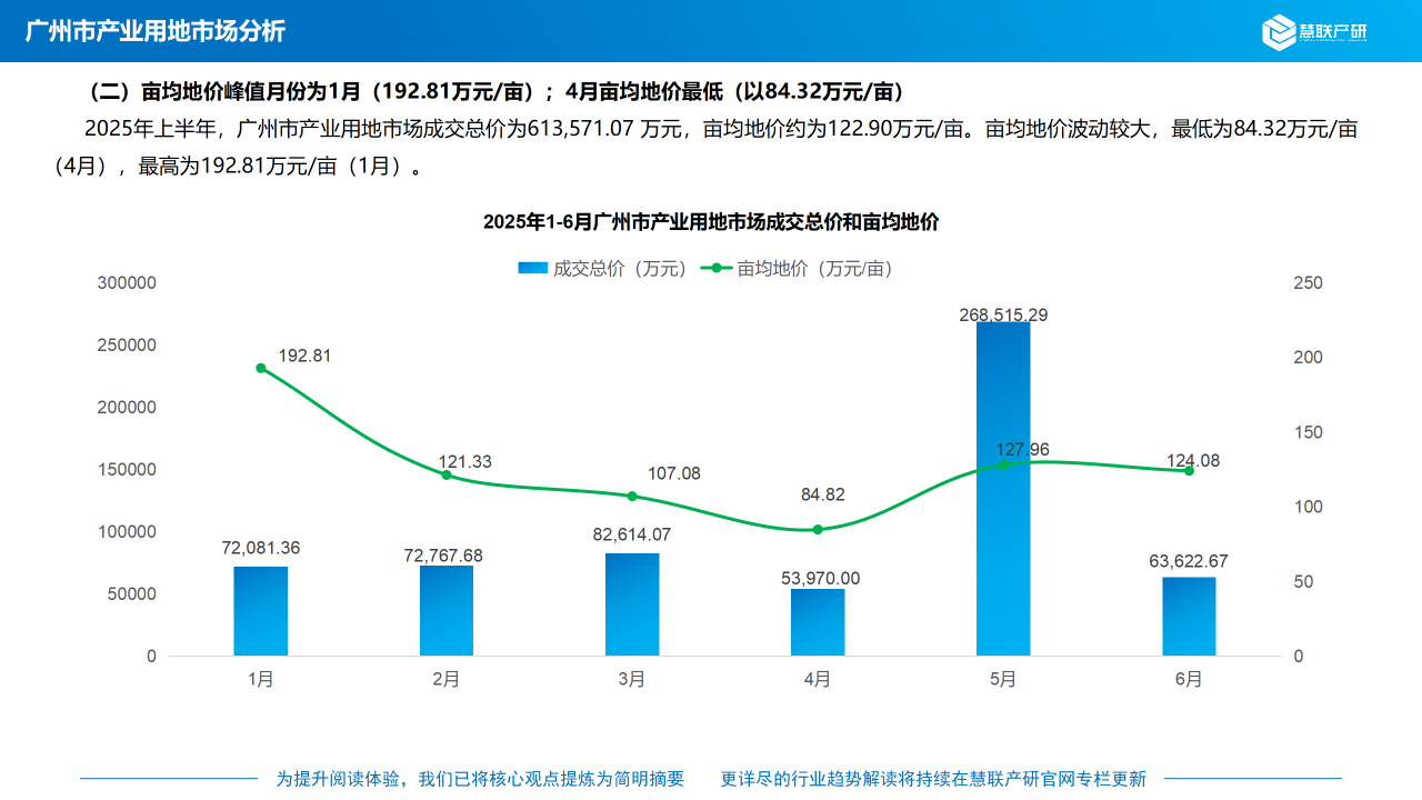 2025年上半年,广州市产业用地市场成交总价为613,571.07 万元,亩均地价约为122.90万元/亩。亩均地价波动较大,最低为84.32万元/亩(4月),最高为192.81元/亩(1月)。
