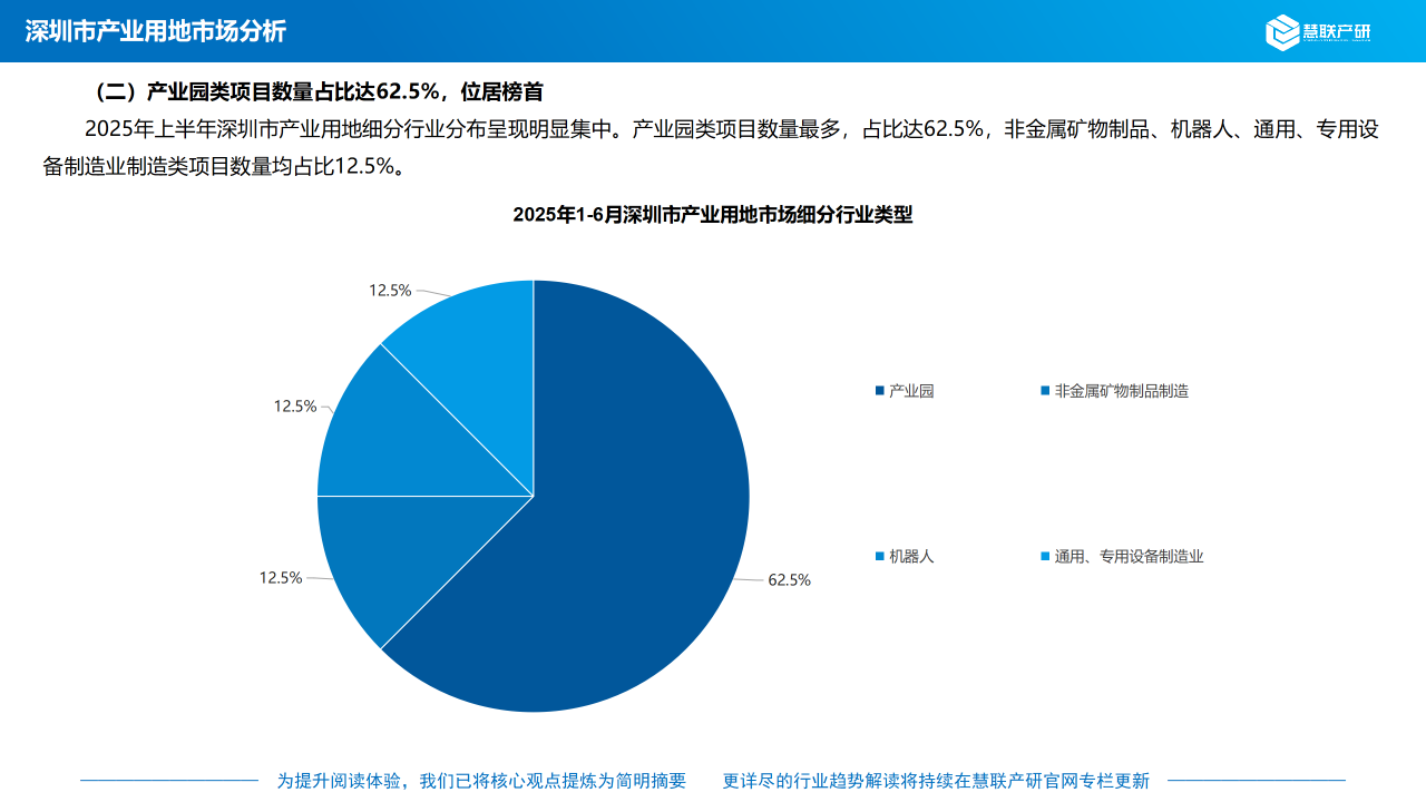 2025年上半年深圳市产业用地细分行业分布呈现明显集中。产业园类项目数量最多,占比达62.5%,非金属矿物制品、机器人、通用、专用设备制造业制造类项目数量均占比12.5%。