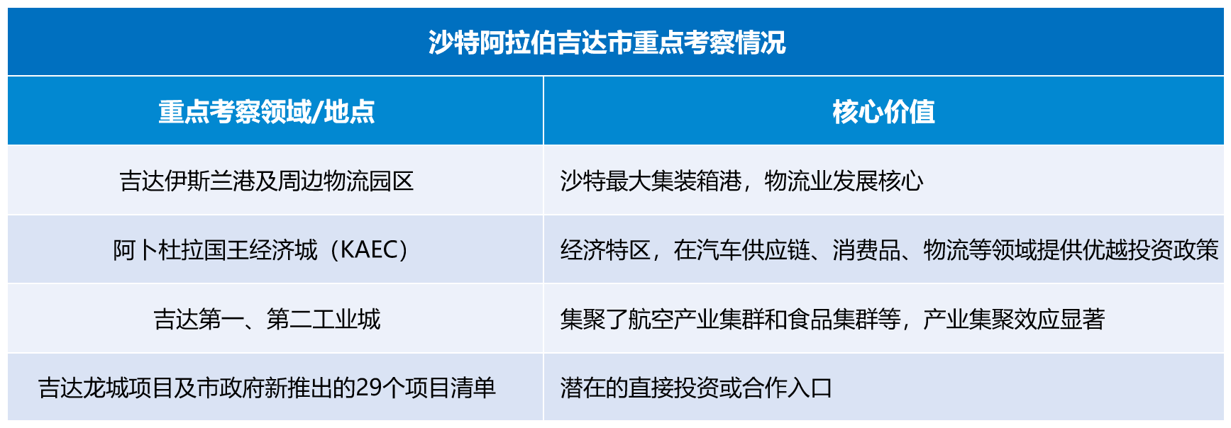 投资考察初步建议:对于投资考察,建议重点关注以下领域和地点:其一,是吉达伊斯兰港及其周边的物流园区,这是沙特最大集装箱港,是物流业发展的核心;其二,是以阿卜杜拉国王经济城(KAEC)为代表的经济特区,其在汽车供应链、消费品、物流等领域提供优越投资政策;其三,是吉达第一、第二工业城,这里集聚了前述的航空产业集群和食品集群等,能直观感受产业集聚效应;其四,可关注吉达龙城项目及市政府新推出的29个项目清单,这些是潜在的直接投资或合作入口。