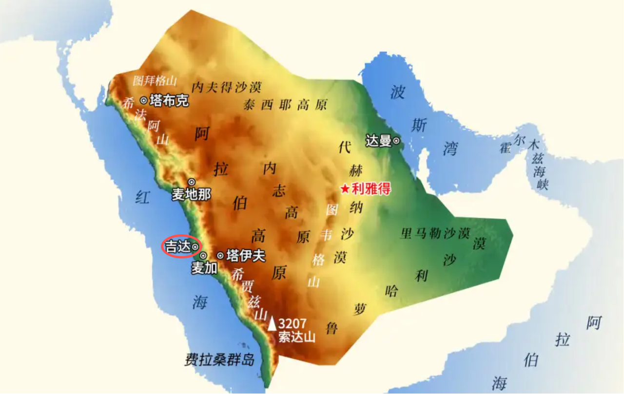 吉达位于沙特阿拉伯王国中西部,红海东岸,是其最大的沿海城市之一。吉达市区面积约1200平方公里,其地理位置极其优越,西濒红海,是连接地中海与印度、阿拉伯半岛和东南亚海上贸易路线上的重要港口。吉达是前往伊斯兰教圣城麦加的主要空中门户,距离麦加仅89公里,通过两圣地高速铁路与麦加和麦地那相连,使其成为重要的物流基地和海陆空交通枢纽。