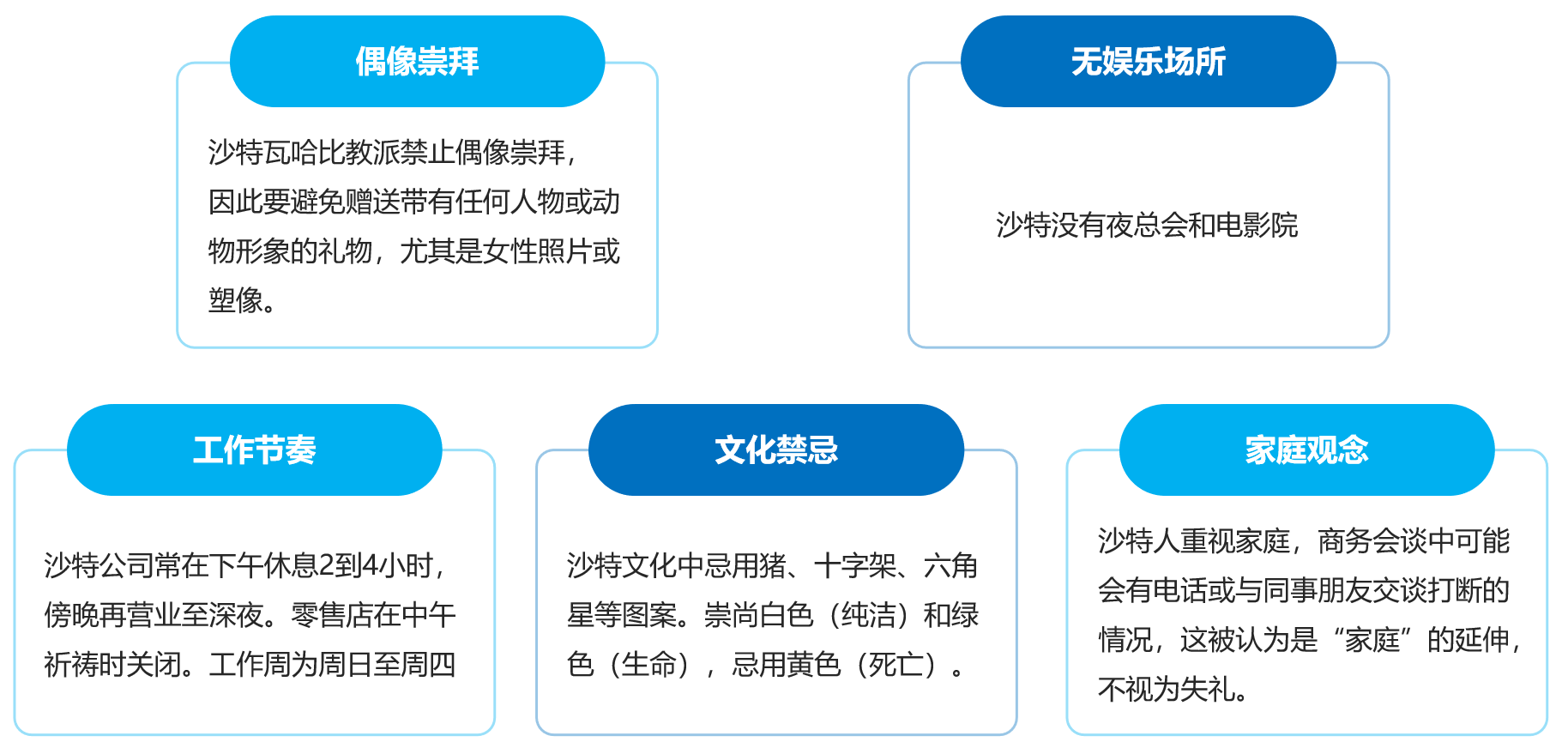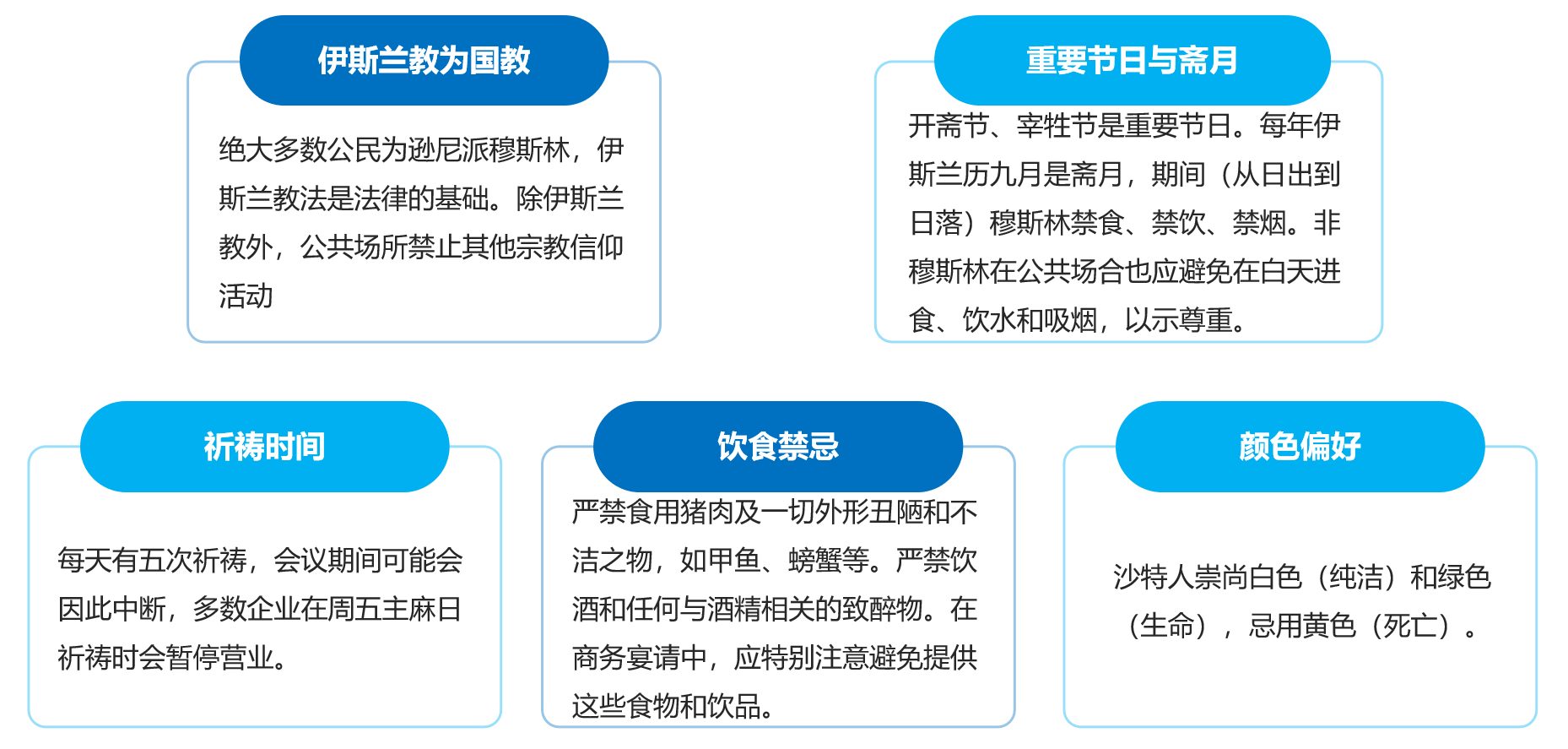 沙特阿拉伯是一个严格奉行伊斯兰教的国家,宗教深度融入社会生活的方方面面,吉达作为其主要经济中心之一,也深受影响。吉达以伊斯兰教为国教且教法为法律基础,公共场所禁其他宗教活动;有开斋节、宰牲节等重要节日,斋月期间穆斯林及非穆斯林在公共场合有相应禁忌;每日五次祈祷,会议或中断,多数企业周五暂停营业;饮食禁猪肉等不洁物和酒;崇尚白、绿色,忌黄色,禁偶像崇拜,勿送带人物动物形象礼物;无夜总会和电影院;工作日下午常休,傍晚营业至深夜,零售店中午祈祷关闭,工作周为周日至周四,文化上忌猪等图案,且沙特人重视家庭,商务会谈被打断不视为失礼。