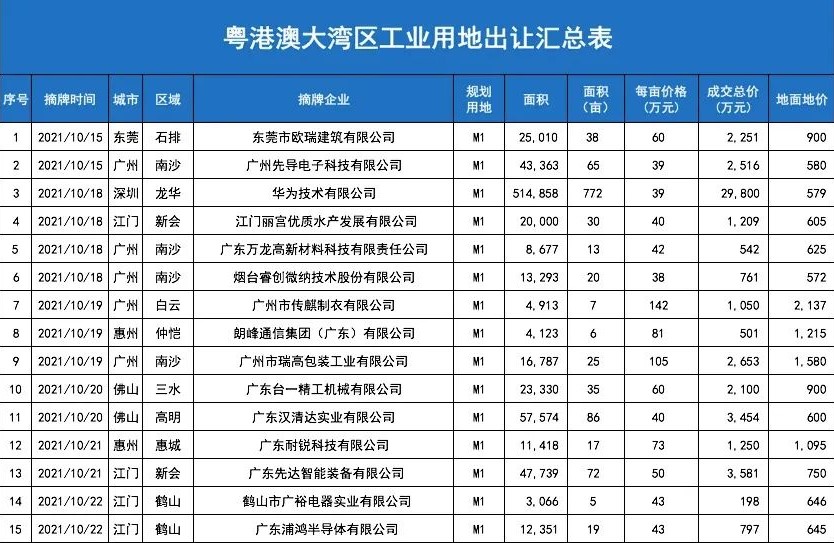 本周粤港澳大湾区一共出让15宗工业用地(M1),全部为制造实体企业摘地。出让面积为806,502㎡(约1210亩)。