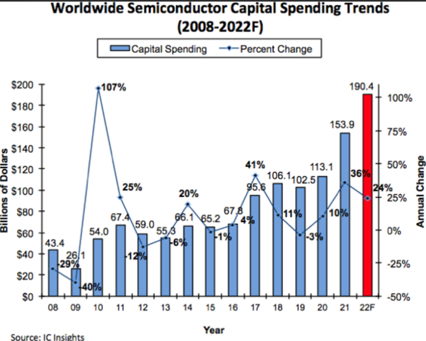 据调研机构IC insights发布的报告显示,继2021年激增36%之后,预计2022年半导体行业资本支出将大增24%,达到1904亿美元的历史新高,比三年前的2019年增长86%。