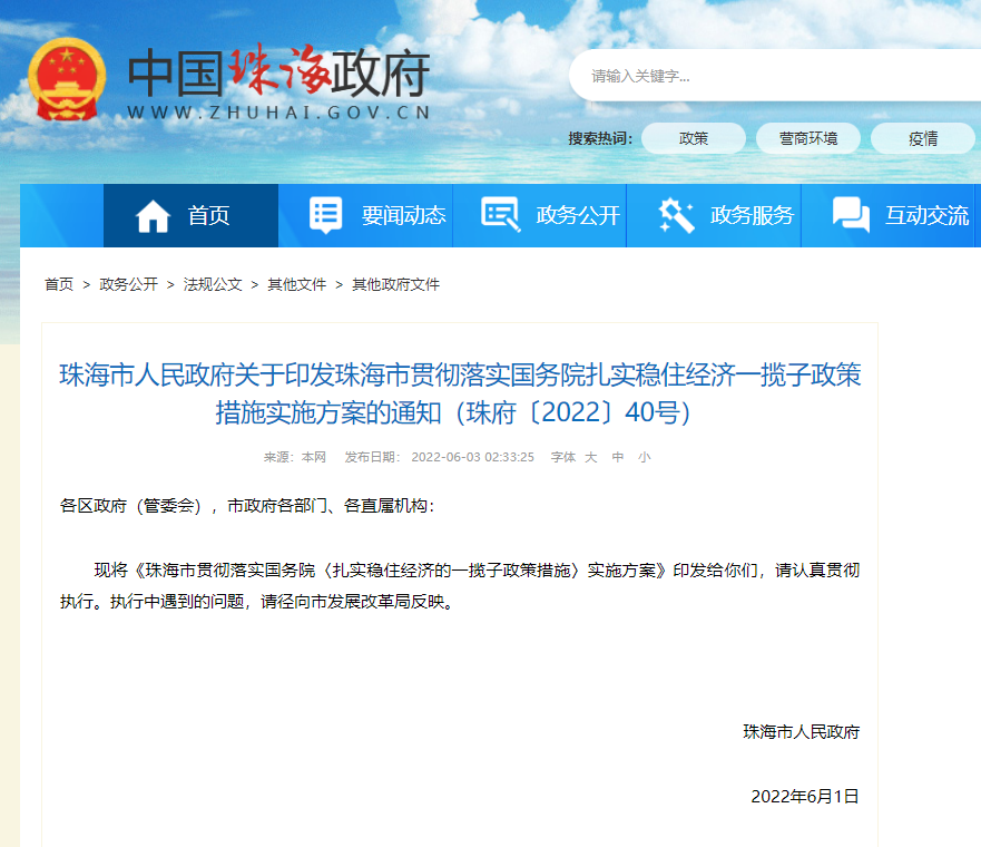 6月3日,珠海市人民政府印发《珠海市贯彻落实国务院扎实稳住经济一揽子政策措施实施方案》