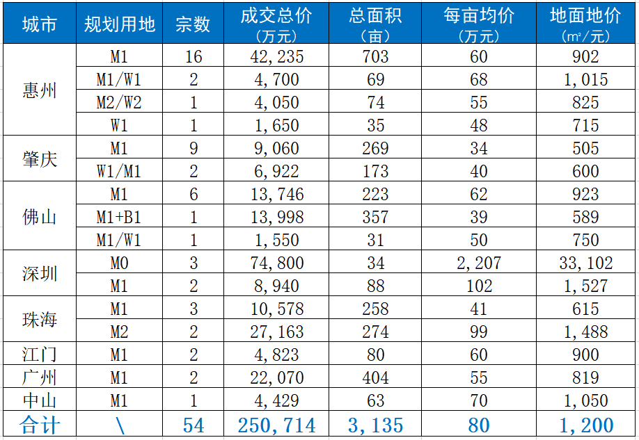 在粤港澳大湾区九市中,惠州市总成交数在本期占据首位,出让宗数为20宗,总成交额52,635万元,每亩均价60万元,地面地价为897㎡/元。