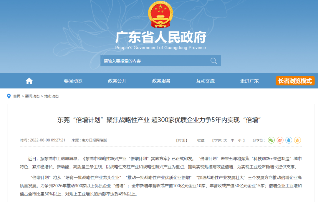6月10日,东莞市印发《东莞市战略性新兴产业“倍增计划”实施方案》