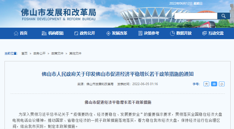 6月5日,佛山市人民政府正式发布《佛山市促进经济平稳增长若干政策措施》