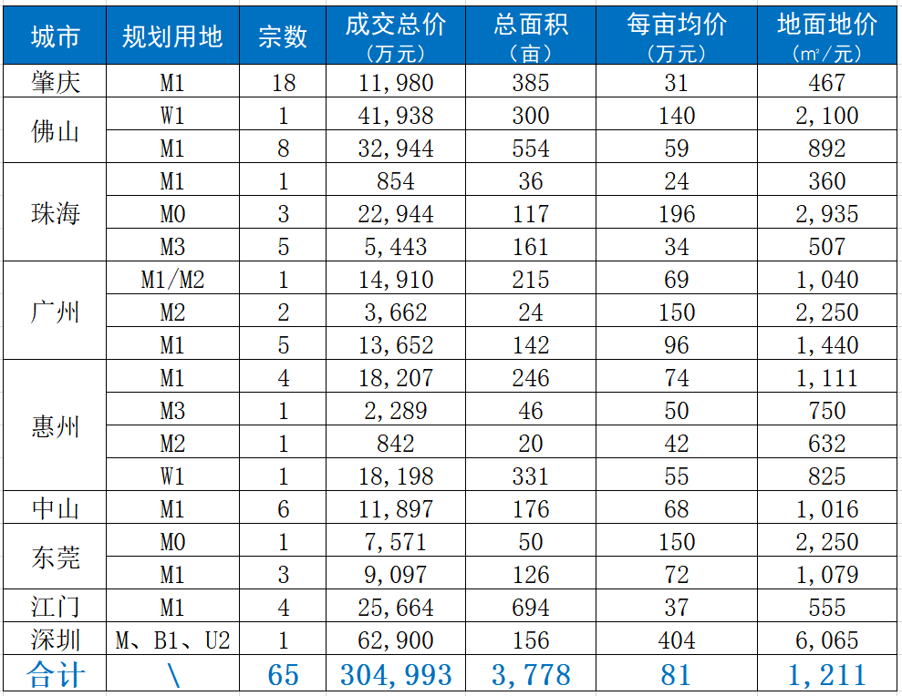 在粤港澳大湾区九市中,肇庆市以18宗成交数占据首位,出让面积约385亩,同比减少了26.17%%;总成交额11,980万元,同比降低了7.82%;每亩均价31万元,同比上涨了24.84%。