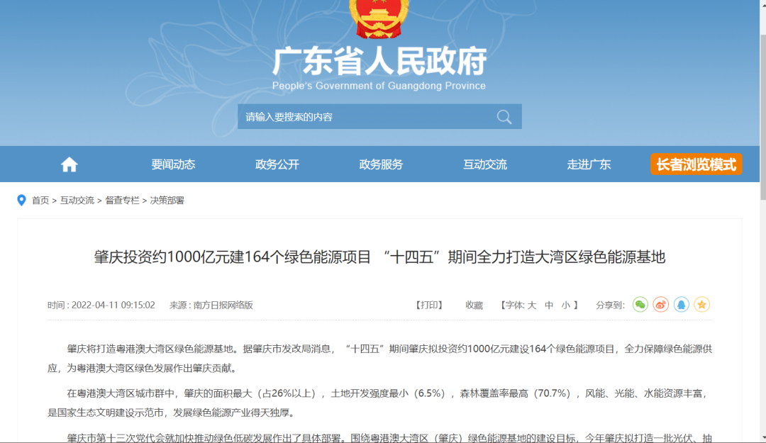 “十四五”期间肇庆拟投资约1000亿元建设164个绿色能源项目,全力保障绿色能源供应,为粤港澳大湾区绿色发展作出肇庆贡献。