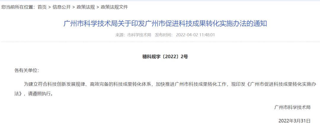 4月2日,《广州市促进科技成果转化实施办法》发布