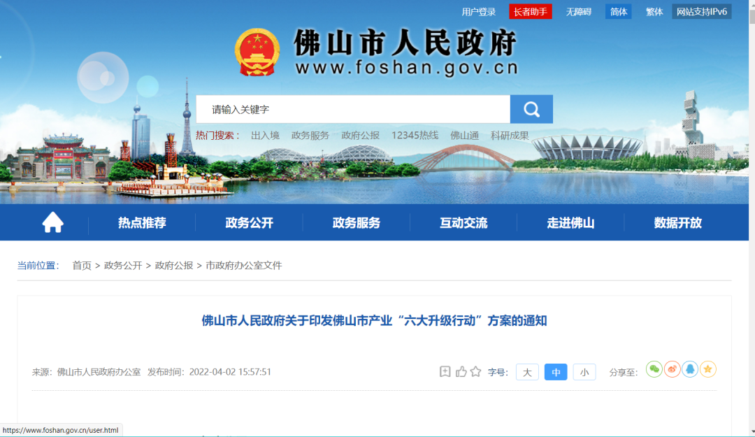 4月2日,佛山市人民政府关于印发佛山市产业“六大升级行动”方案的通知