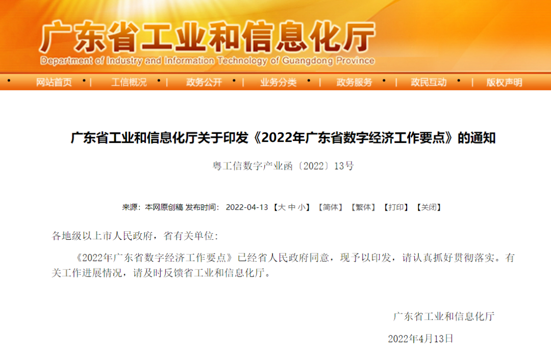 4月13日,广东省工业和信息化厅关于印发《2022年广东省数字经济工作要点》的通知