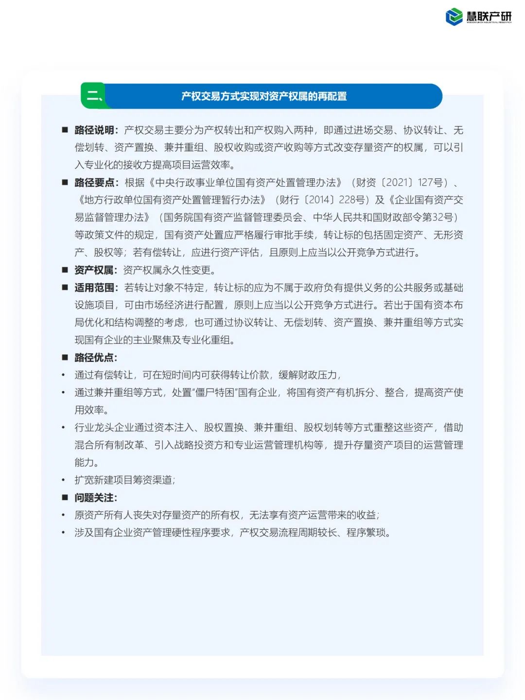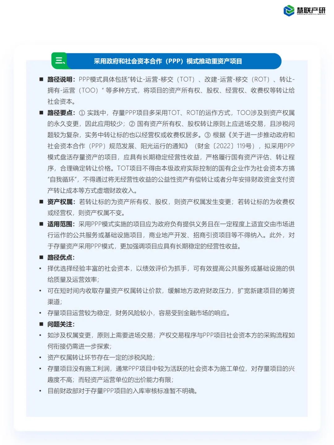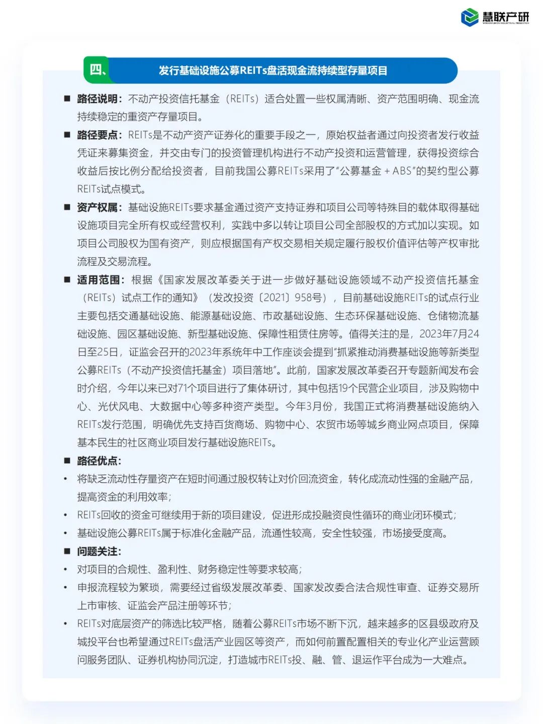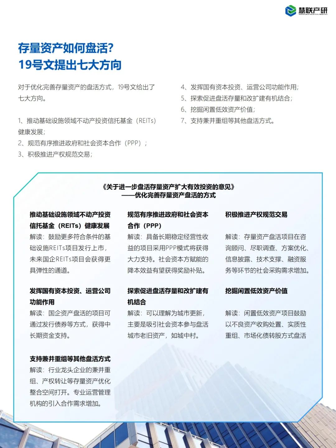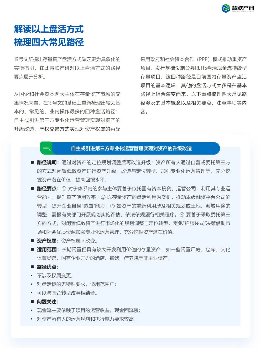 19号文提出了七大存量资产盘活方式,但缺乏更为具象化的实操指引,在此慧联产研对盘活方式的路径要点展开解读及分析。