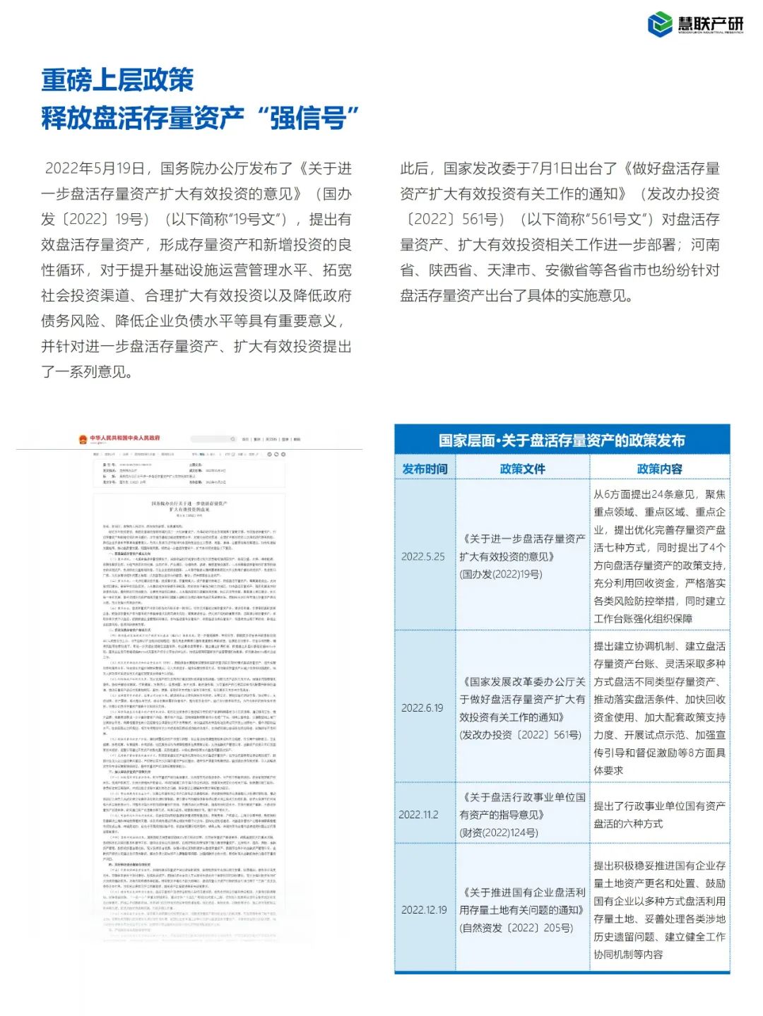 2022年5月19日,国务院办公厅发布了《关于进一步盘活存量资产扩大有效投资的意见》(国办发〔2022〕19号)(以下简称“19号文”),提出有效盘活存量资产,形成存量资产和新增投资的良性循环,对于提升基础设施运营管理水平、拓宽社会投资渠道、合理扩大有效投资以及降低政府债务风险、降低企业负债水平等具有重要意义,并针对进一步盘活存量资产、扩大有效投资提出了一系列意见。