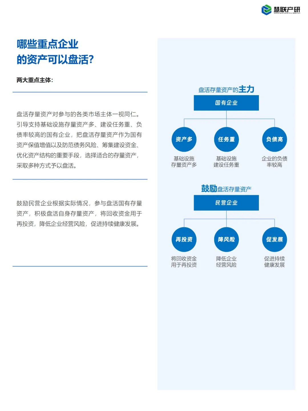 投资作为GDP经济增长的三驾马车之一,有效才是真动力,扩大有效投资即是为经济增长增加驱动力,慧联产研认为,在当今世界格局摇晃的存量经济时代下,国家高位推动的“存量盘活策略”将是一场明确且坚定的持久性改革,当中所触及到深层次的问题包括:一方面,国企和地方政府过去的无序低效的投资和运营,积累了相当多的债务,导致目前国内债务和财政收支系统性问题严峻,希望借此缓解国企和地方政府的债务问题,非一时半刻可以解决,而存量资产就是最大的消纳池,剥离不良资产、冲抵不良债务等,另一方面可以借此激活优质资产,获得持续可观的收入,并且可吸引了解市场需求的民营企业参与,民营企业相对更具有灵敏的市场嗅觉,市场化的投资视角及运营管理经验,可以修补政府在存量资产盘活过程中的短板。